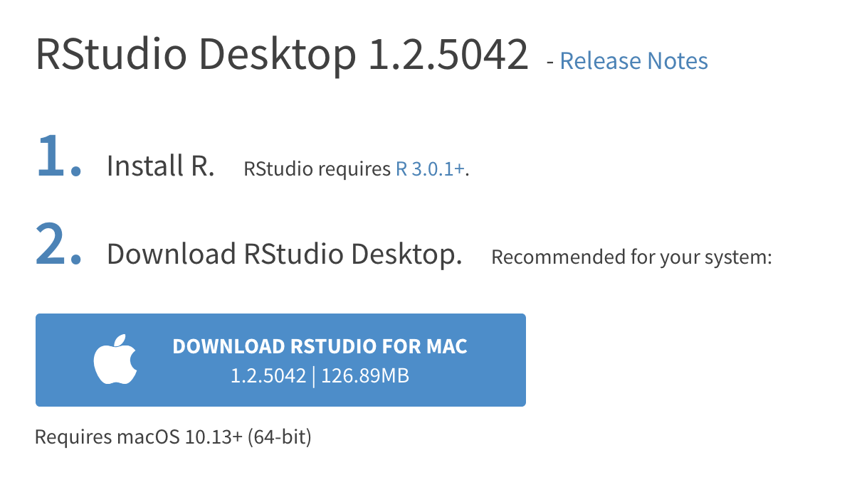 Next, you need to install RStudio, the nicer graphical user interface (GUI) for R (the dashboard). Once R and RStudio are both installed, you can ignore R and only use RStudio. RStudio will use R automatically and you won’t ever have to interact with it directly.