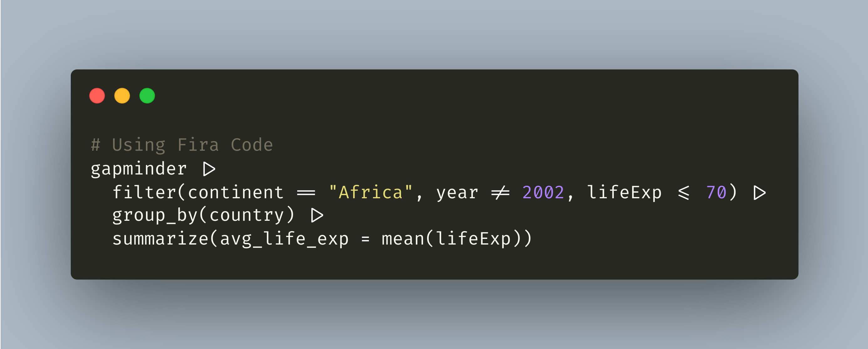 If you want to be fancy and cool, you can download and install a special programming font named Fira Code that uses some typographic magic to make certain combinations of characters appear differently in RStudio.