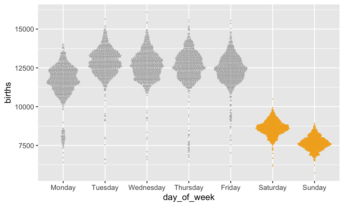mapping = aes(x = day_of_week, y = births, color = weekend)) +