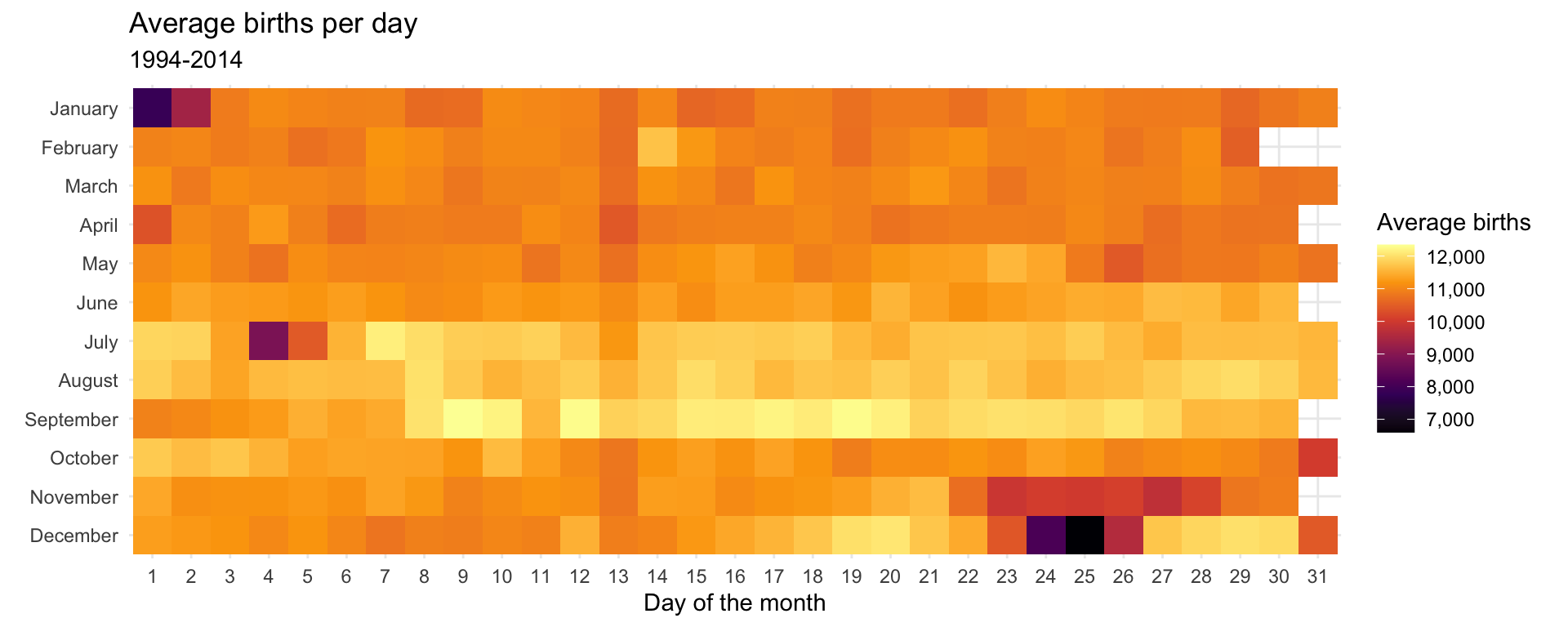 Finally, let's use something non-traditional to show the average births by day in a somewhat proportional way. We can calculate the average number of births every day and then make a heatmap that fills each square by that average, thus showing the relative differences in births per day.