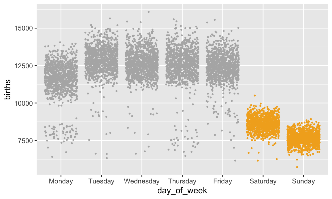 If we fill by day of the week, we get 7 different colors, which is fine (I guess), but doesn't really help tell a story. The main story here is that there are far fewer births during weekends. If we create a new column that flags if a row is Saturday or Sunday, we can fill by that column instead:
