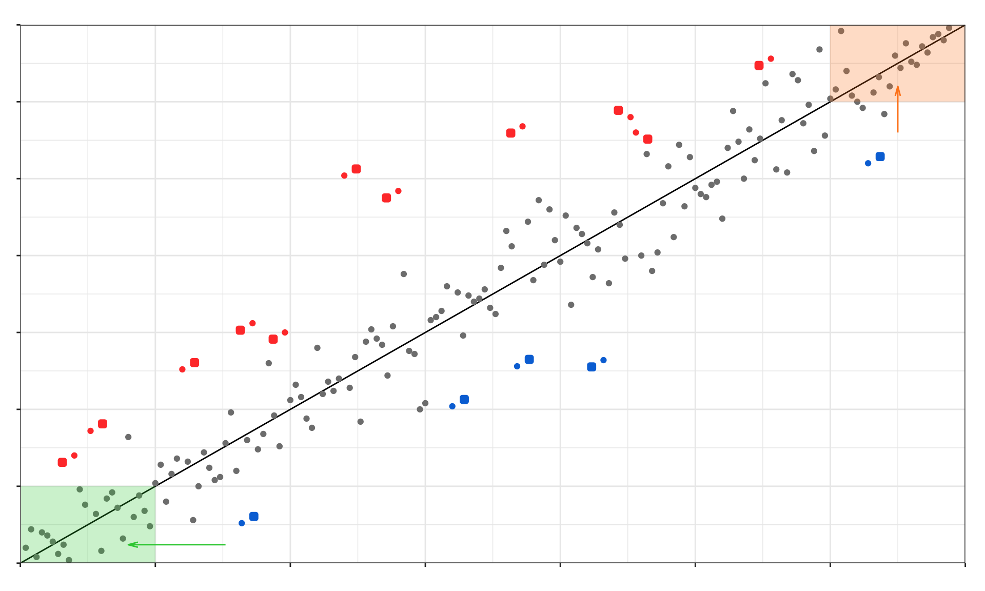 annotate(geom = "segment", x = 0, xend = 175, y = 0, yend = 175) +