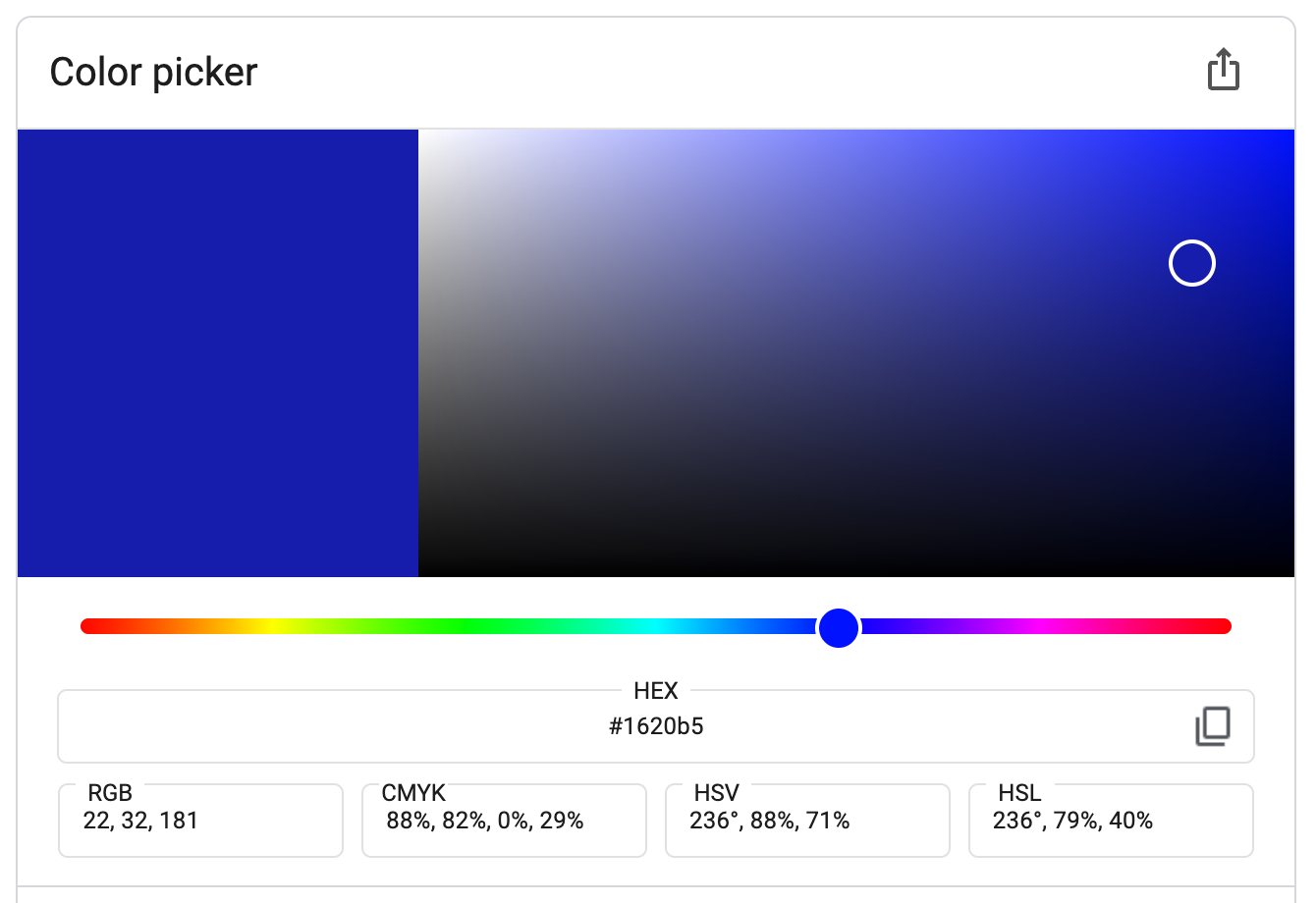 In practice, as shown in this video, very very few people can intuitively read these codes. Most of the time, you copy and paste them into whatever you’re doing. You can find them by using color pickers, like this one that appears when you search Google for “color picker”. These tools show you all sorts of different representations of the color, like RGB values that range from 0 to 255, CMYK values that range from 0% to 100%, hex codes, and so on: