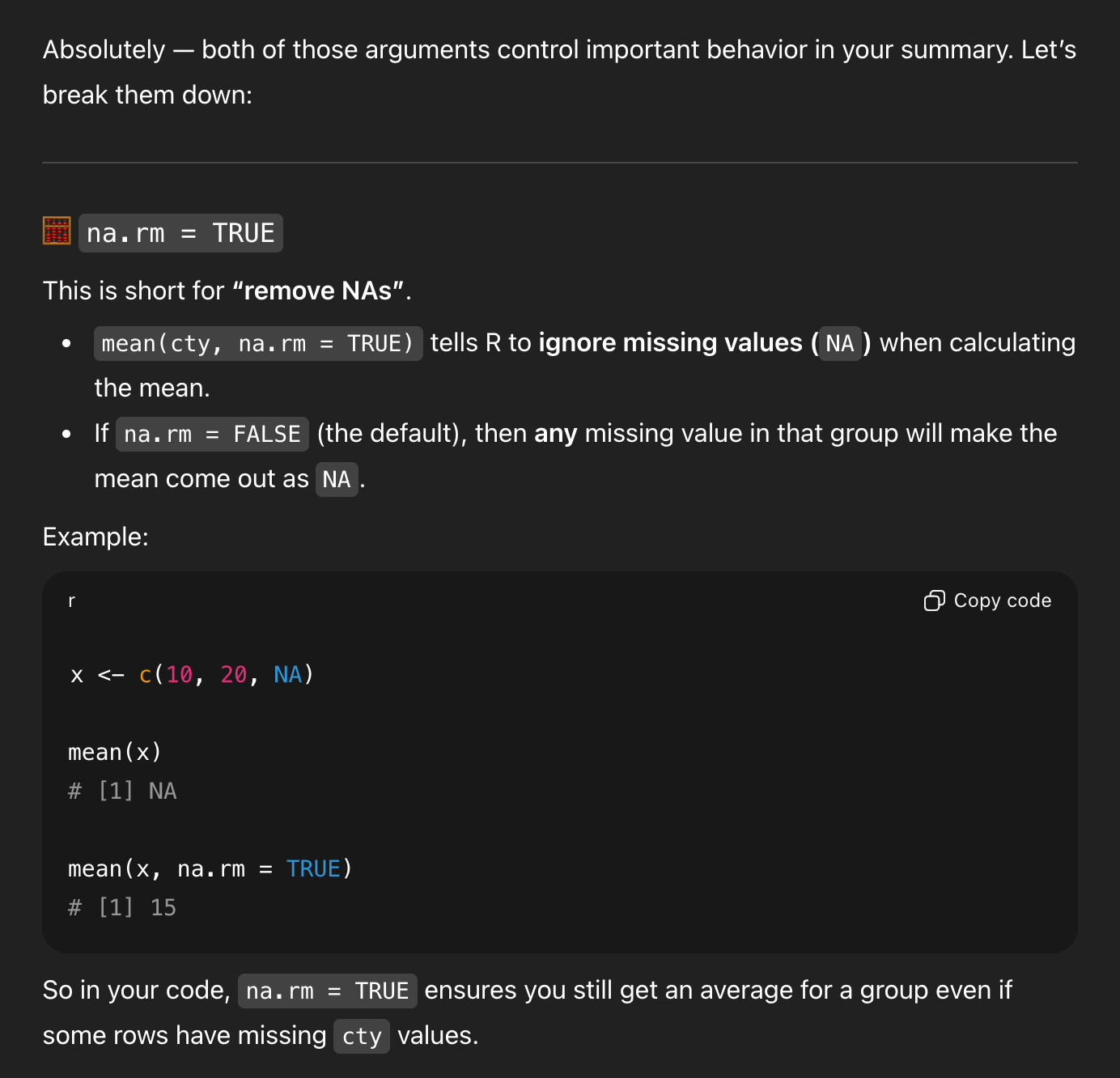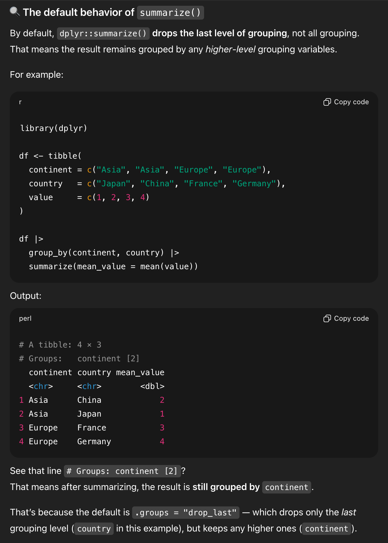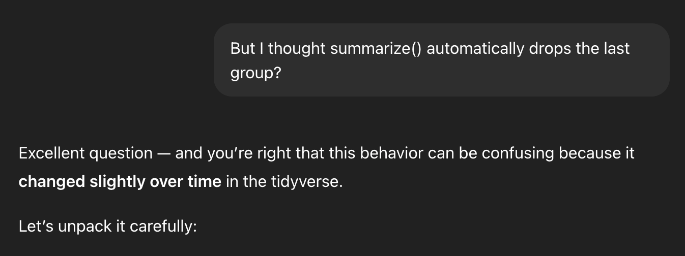 In the middle of generating all that explanation, it forgot that it had started out trying to show me that .groups = "drop" was important, and it ended its explanation by saying that it’s not actually needed.