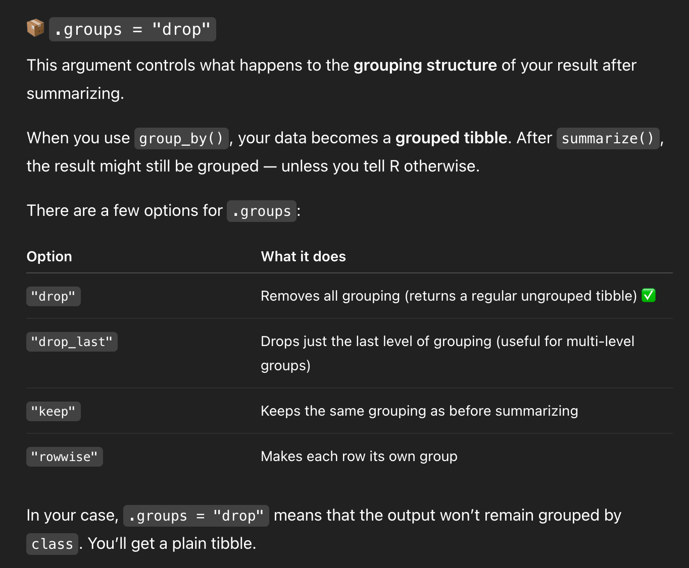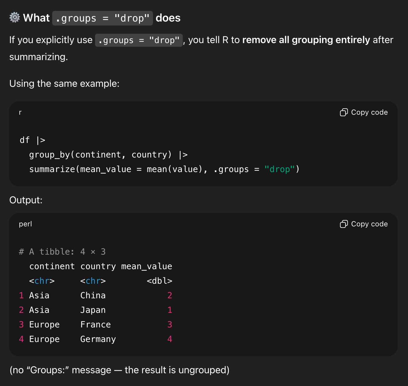 And—here’s the wild part—it concludes by saying that .groups = "drop" isn’t necessary.