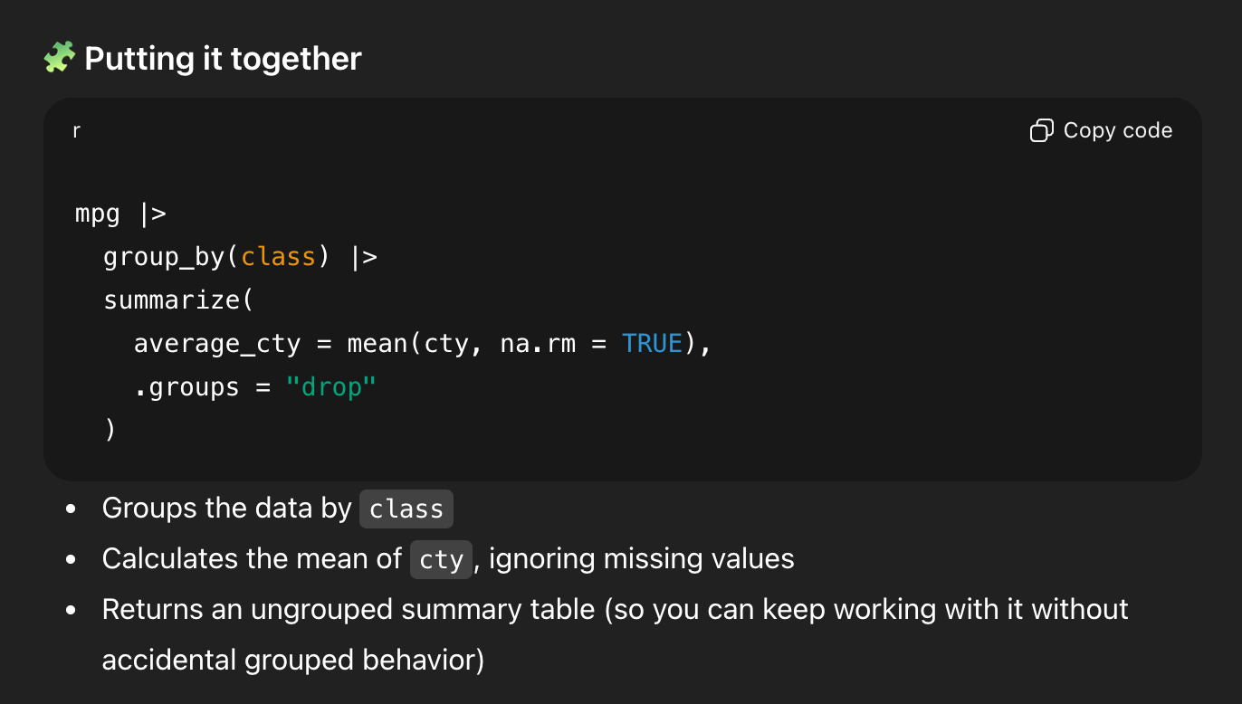 If you ask ChatGPT for code to calculate the average city MPG for cars by class in the mpg dataset, it will happily do it, and it’ll generate something like this: