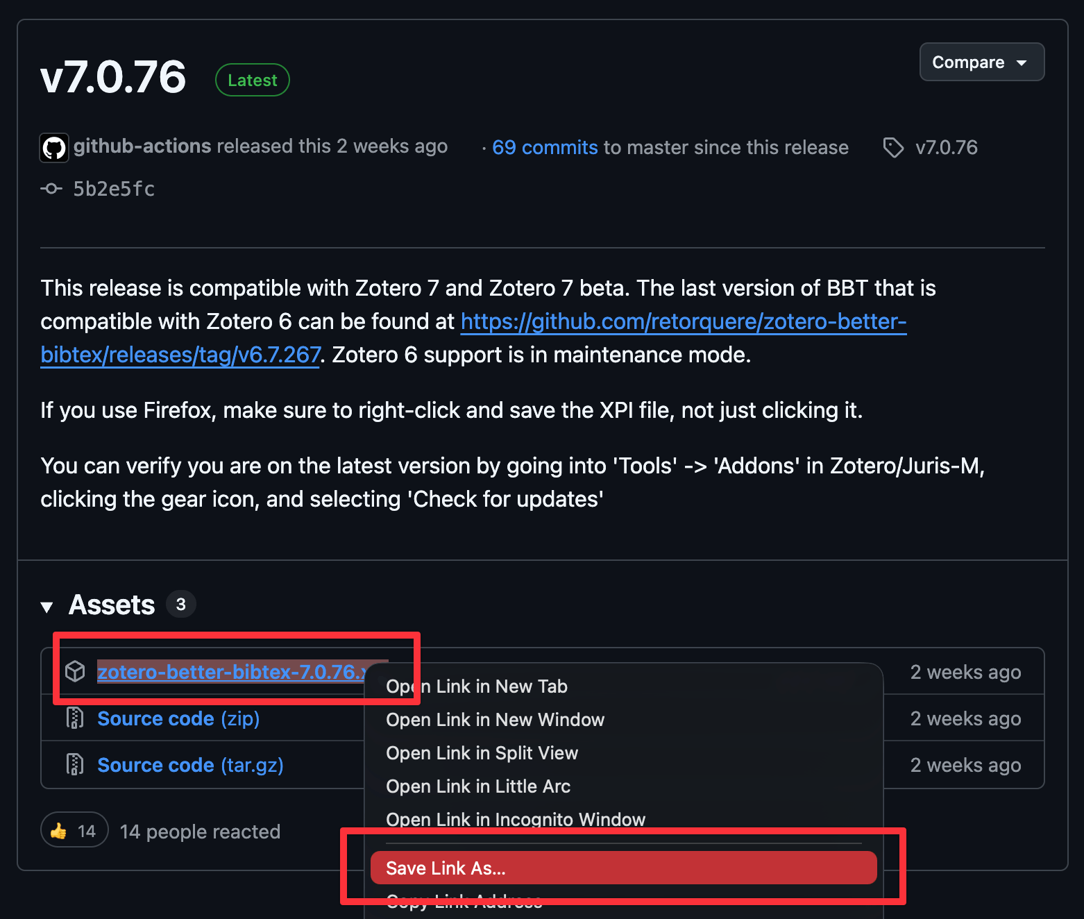 zotero-better-bibtex-VERSION.xpifile at GitHub and choosing “Save as.” Don’t double-click on it or try opening it after downloading it—you don’t need to.