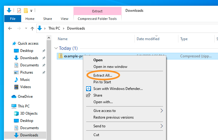 Instead, you need to right click on the .zip file and select “Extract All…”:
