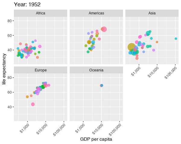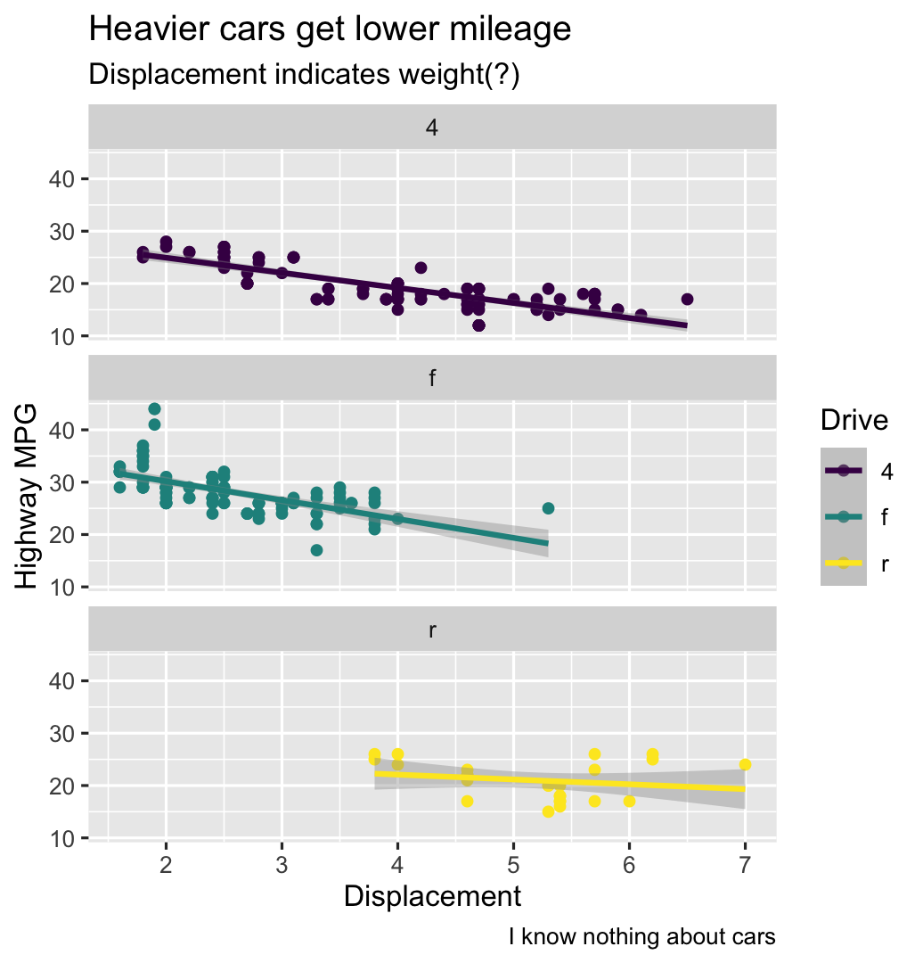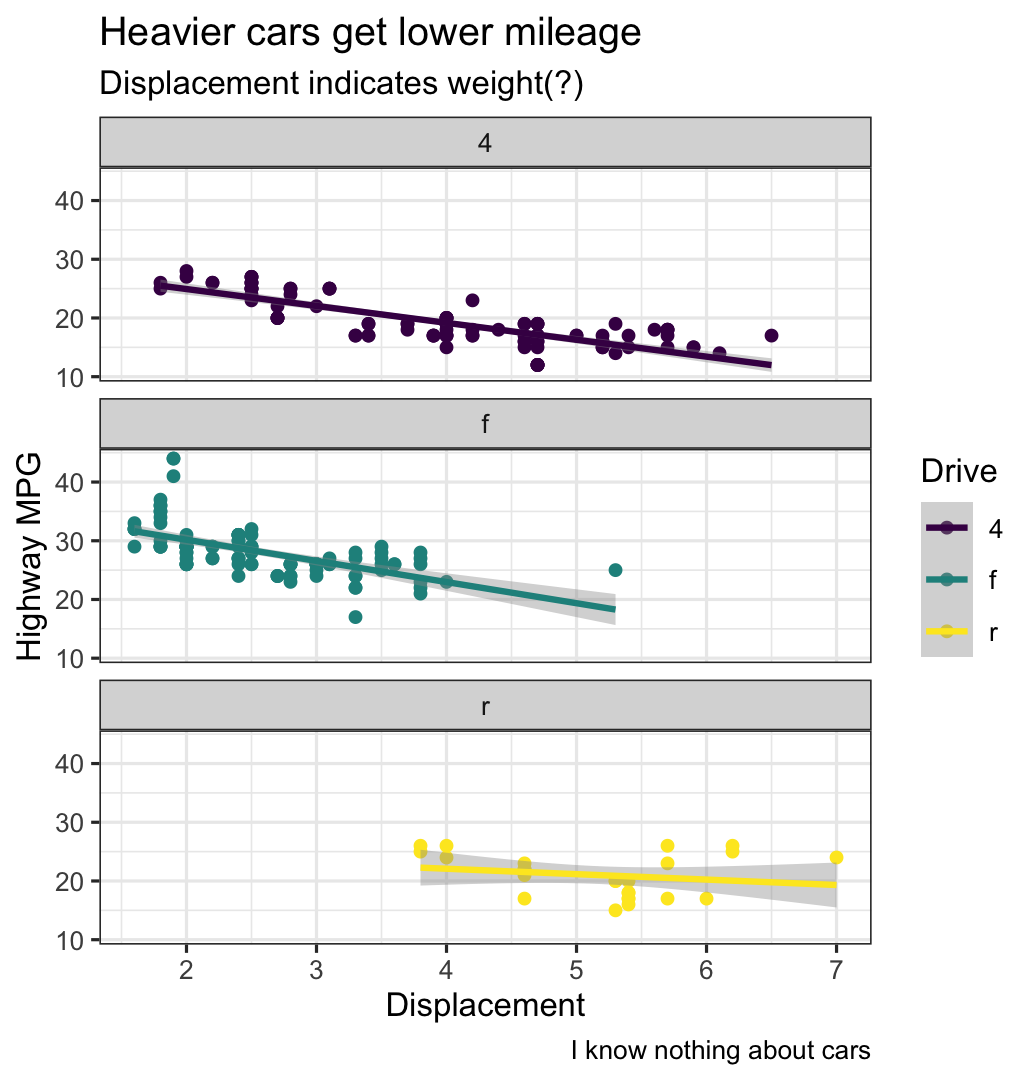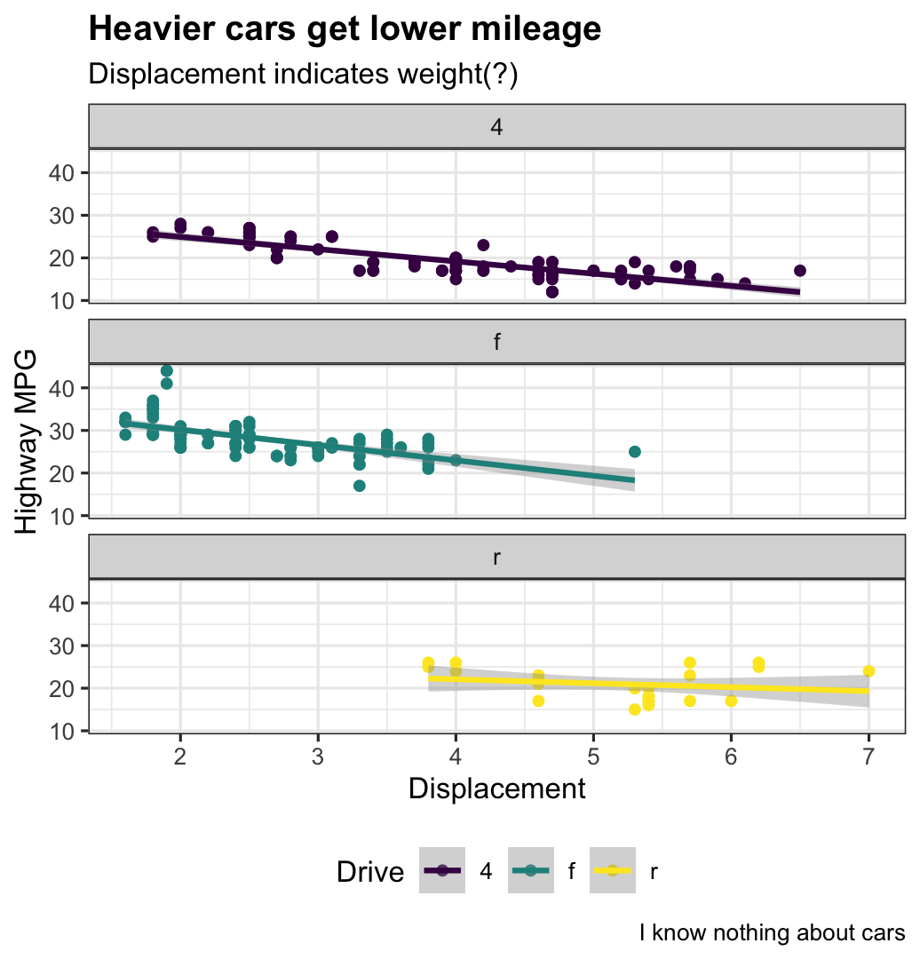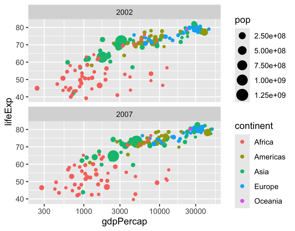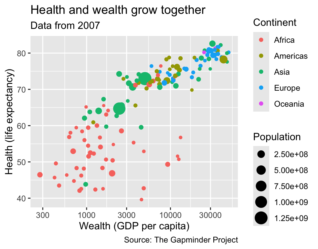 class: center middle main-title section-title-4 # Mapping Data<br>to Graphics .class-info[ **Session 3** .light[ISS Data Visualization with R<br> Faculty of International Social Sciences, Gakushuin University<br> Spring 2026] ] --- name: outline class: title title-inv-7 # Plan for today -- .box-4.medium.sp-after-half[Data, aesthetics, & the grammar of graphics] -- .box-2.medium.sp-after-half[Grammatical layers] -- .box-3.medium.sp-after-half[Aesthetics in extra dimensions] -- .box-6.medium[Tidy data] --- name: grammar-of-graphics class: center middle section-title section-title-4 animated fadeIn # Data, aesthetics,<br>& the grammar of graphics --- class: bg-full bg-y-75 background-image: url("img/03/napoleon-retreat.jpg") ??? Source: [Wikipedia](https://en.wikipedia.org/wiki/File:National_Museum_in_Poznan_-_Przej%C5%9Bcie_przez_Berezyn%C4%99.JPG) --- layout: true class: title title-4 --- # Long distance! .center[ <figure> <img src="img/03/napoleon-google-maps.png" alt="Moscow to Vilnius" title="Moscow to Vilnius" width="80%"> <figcaption>Moscow to Vilnius</figcaption> </figure> ] --- # Very cold! <img src="03-slides_files/figure-html/minard-temps-1.png" width="864" style="display: block; margin: auto;" /> --- # Lots of people died! <img src="03-slides_files/figure-html/minard-deaths-1.png" width="468" style="display: block; margin: auto;" /> --- layout: false class: bg-full background-image: url("img/03/minard.png") ??? Source: [Wikimedia Commons](https://upload.wikimedia.org/wikipedia/commons/2/29/Minard.png) --- layout: true class: title title-4 --- # Mapping data to aesthetics .pull-left.center[ <figure> <img src="img/03/gg-book.jpg" alt="ZZZ" title="ZZZ" width="55%"> </figure> ] .pull-right[ .box-inv-4.medium[Aesthetic] .box-4[Visual property of a graph] .box-4.sp-after[Position, shape, color, etc.] .box-inv-4.medium[Data] .box-4[A column in a dataset] ] --- # Mapping data to aesthetics <table> <tr> <th class="cell-left">Data</th> <th class="cell-left">Aesthetic</th> <th class="cell-left">Graphic/Geometry</th> </tr> <tr> <td class="cell-left">Longitude</td> <td class="cell-left">Position (x-axis) </td> <td class="cell-left">Point</td> </tr> <tr> <td class="cell-left">Latitude</td> <td class="cell-left">Position (y-axis)</td> <td class="cell-left">Point</td> </tr> <tr> <td class="cell-left">Army size</td> <td class="cell-left">Size</td> <td class="cell-left">Path</td> </tr> <tr> <td class="cell-left">Army direction </td> <td class="cell-left">Color</td> <td class="cell-left">Path</td> </tr> <tr> <td class="cell-left">Date</td> <td class="cell-left">Position (x-axis)</td> <td class="cell-left">Line + text</td> </tr> <tr> <td class="cell-left">Temperature</td> <td class="cell-left">Position (y-axis)</td> <td class="cell-left">Line + text</td> </tr> </table> --- # Mapping data to aesthetics <table> <tr> <th class="cell-left">Data</th> <th class="cell-left"><code class="remark-inline-code">aes()</code></th> <th class="cell-left"><code class="remark-inline-code">geom</code></th> </tr> <tr> <td class="cell-left">Longitude</td> <td class="cell-left"><code class="remark-inline-code">x</code></td> <td class="cell-left"><code class="remark-inline-code">geom_point()</code></td> </tr> <tr> <td class="cell-left">Latitude</td> <td class="cell-left"><code class="remark-inline-code">y</code></td> <td class="cell-left"><code class="remark-inline-code">geom_point()</code></td> </tr> <tr> <td class="cell-left">Army size</td> <td class="cell-left"><code class="remark-inline-code">size</code></td> <td class="cell-left"><code class="remark-inline-code">geom_path()</code></td> </tr> <tr> <td class="cell-left">Army direction </td> <td class="cell-left"><code class="remark-inline-code">color</code> </td> <td class="cell-left"><code class="remark-inline-code">geom_path()</code></td> </tr> <tr> <td class="cell-left">Date</td> <td class="cell-left"><code class="remark-inline-code">x</code></td> <td class="cell-left"><code class="remark-inline-code">geom_line() + geom_text()</code></td> </tr> <tr> <td class="cell-left">Temperature</td> <td class="cell-left"><code class="remark-inline-code">y</code></td> <td class="cell-left"><code class="remark-inline-code">geom_line() + geom_text()</code></td> </tr> </table> --- # `ggplot()` template -- --- layout: false .box-4[This is a dataset named `troops`:] .small[ <table> <thead> <tr> <th style="text-align:left;"> longitude </th> <th style="text-align:left;"> latitude </th> <th style="text-align:left;"> direction </th> <th style="text-align:left;"> survivors </th> </tr> </thead> <tbody> <tr> <td style="text-align:left;"> 24 </td> <td style="text-align:left;"> 54.9 </td> <td style="text-align:left;"> A </td> <td style="text-align:left;"> 340000 </td> </tr> <tr> <td style="text-align:left;"> 24.5 </td> <td style="text-align:left;"> 55 </td> <td style="text-align:left;"> A </td> <td style="text-align:left;"> 340000 </td> </tr> <tr> <td style="text-align:left;"> … </td> <td style="text-align:left;"> … </td> <td style="text-align:left;"> … </td> <td style="text-align:left;"> … </td> </tr> </tbody> </table> ] -- --- <img src="03-slides_files/figure-html/show-basic-minard-1.png" width="100%" style="display: block; margin: auto;" /> --- class: bg-full background-image: url("img/03/rosling-tedx.jpg") ??? Source: [New York Times](https://www.nytimes.com/2017/02/09/world/europe/hans-rosling-dead-statistician.html) --- class: bg-full background-image: url("img/03/gapminder-screenshot.png") ??? Source: [Gapminder](https://www.gapminder.org/tools/#$chart-type=bubbles) --- layout: true class: title title-4 --- # Mapping data to aesthetics <table> <tr> <th class="cell-left">Data</th> <th class="cell-left"><code class="remark-inline-code">aes()</code></th> <th class="cell-left"><code class="remark-inline-code">geom</code></th> </tr> <tr> <td class="cell-left">Wealth (GDP/capita)</td> <td class="cell-left"><code class="remark-inline-code">x</code></td> <td class="cell-left">